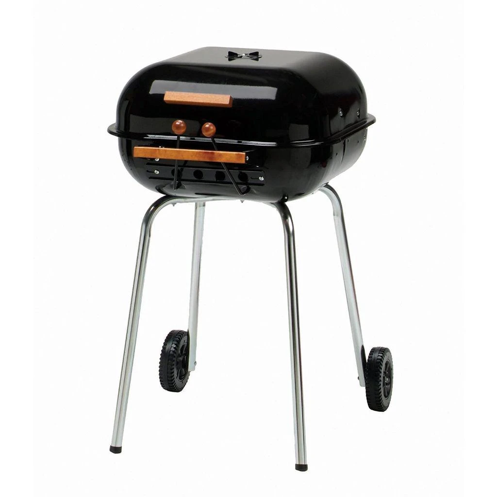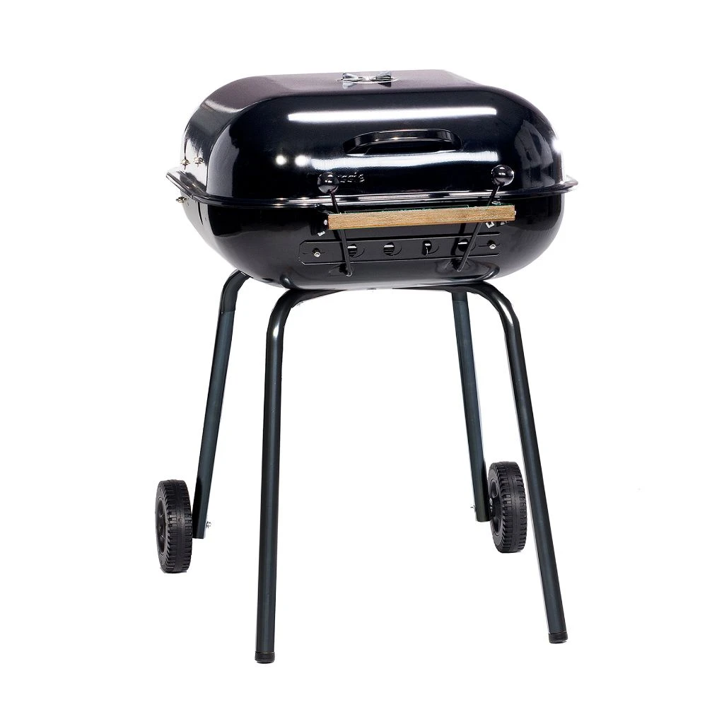 - With its tilt-away hood and adjustable air vents, this grill makes checking on your food and controlling temperature easy. Designed for easy transport with its easy-rolling wheels.
