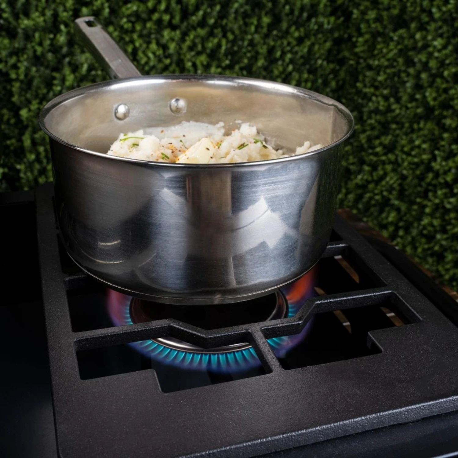 - 22″ Cooking Space-362 In 3 Easily controlled cooking zone with powerful 24,000 BTU output – in addition to 12,000 BTU stainless side burner with cast iron grate.