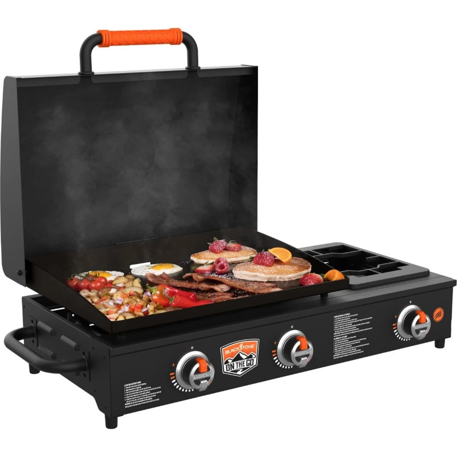 The Blackstone On The Go 22″ Table Top Griddle w/Side Burner is the ideal package. Combine the already great tabletop griddle with a 12,000 BTU disk side burner, and this griddle will cook anywhere, any time of the year! A hood with a non-slip grip protects your griddle surface and traps 24,000 total BTUs of heat when grilling, no matter the location. Blackstone’s On The Go combos are perfect for long hunts, fishing expeditions, or family camping trips. With 361 square inches of cooking space, this unit will cook burgers, hot dogs, steaks, eggs, pancakes, and much more. Dual H-syle burners evenly distribute heat across the griddle surface in two separate cooking zones, giving you ultimate control. This ultimate combination of Blackstone is sure to bring good food and memories to the whole family!