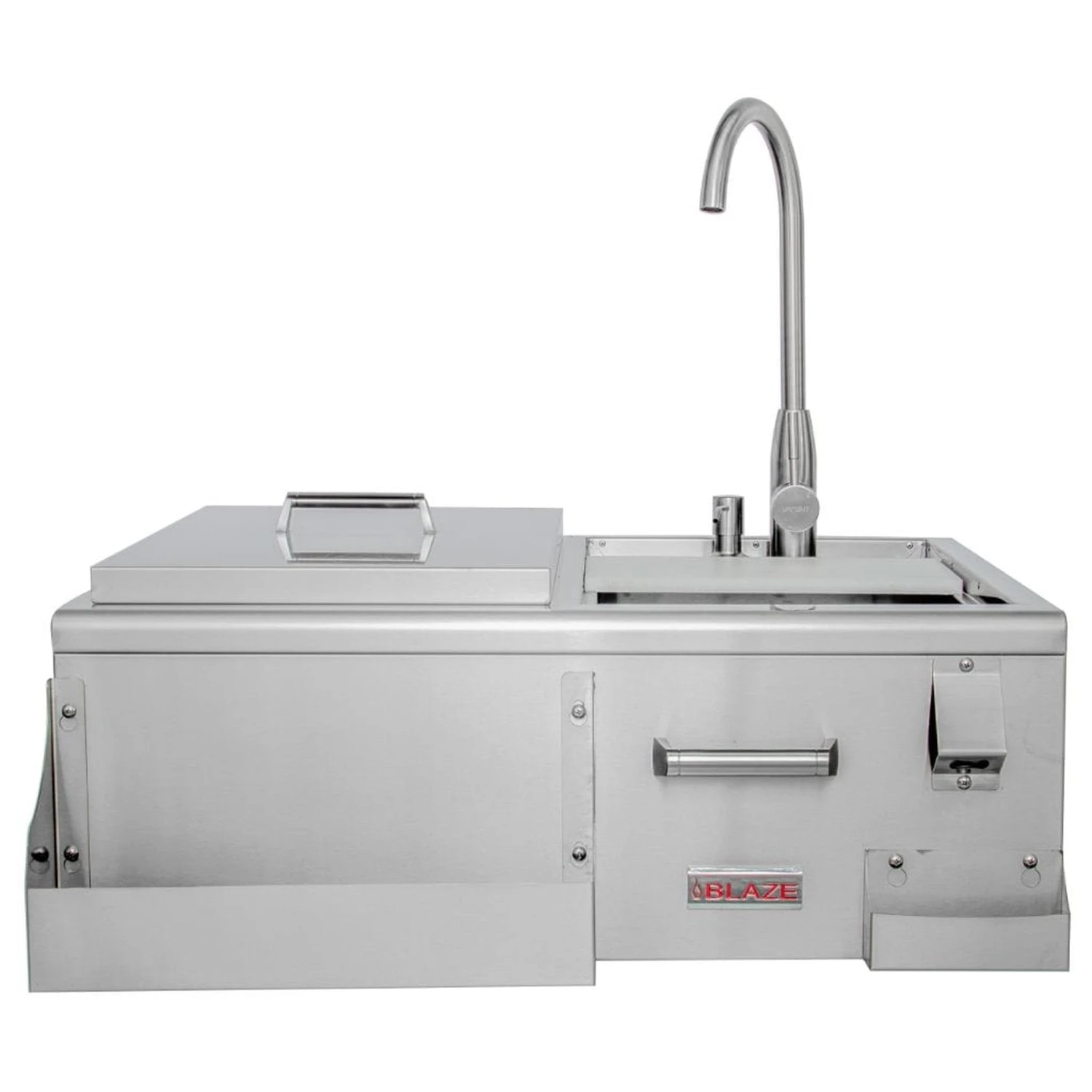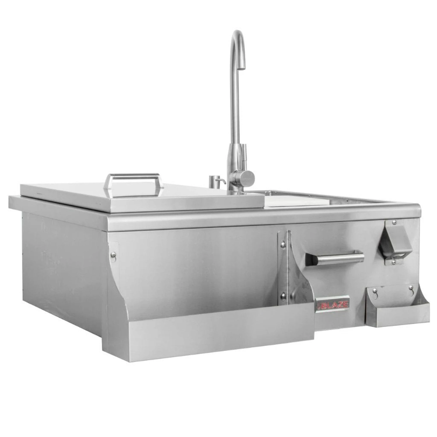 The Blaze Beverage Center was designed with both style and usability in mind. For quick and easy access, there is an attached bottle opener, a built-in soap dispenser, a front bottle storage and a removable three-part condiment tray. Plus, Blaze includes a cutting board that slides across the sink and can be removed for extra space. Made from 304 stainless steel, this beverage center is both durable and stylish with a sleek design and curved edges. This beverage center fits perfectly in any outdoor kitchen.