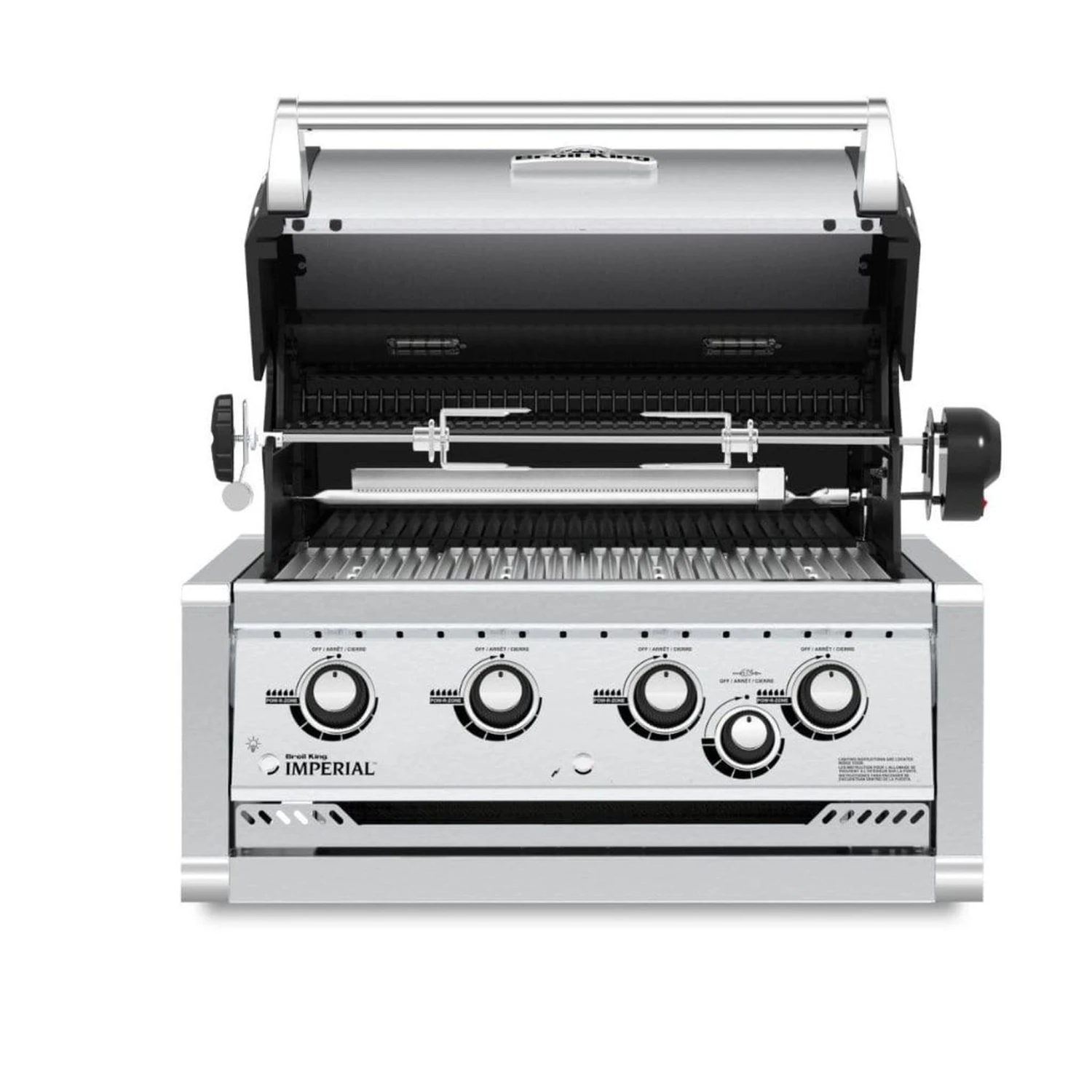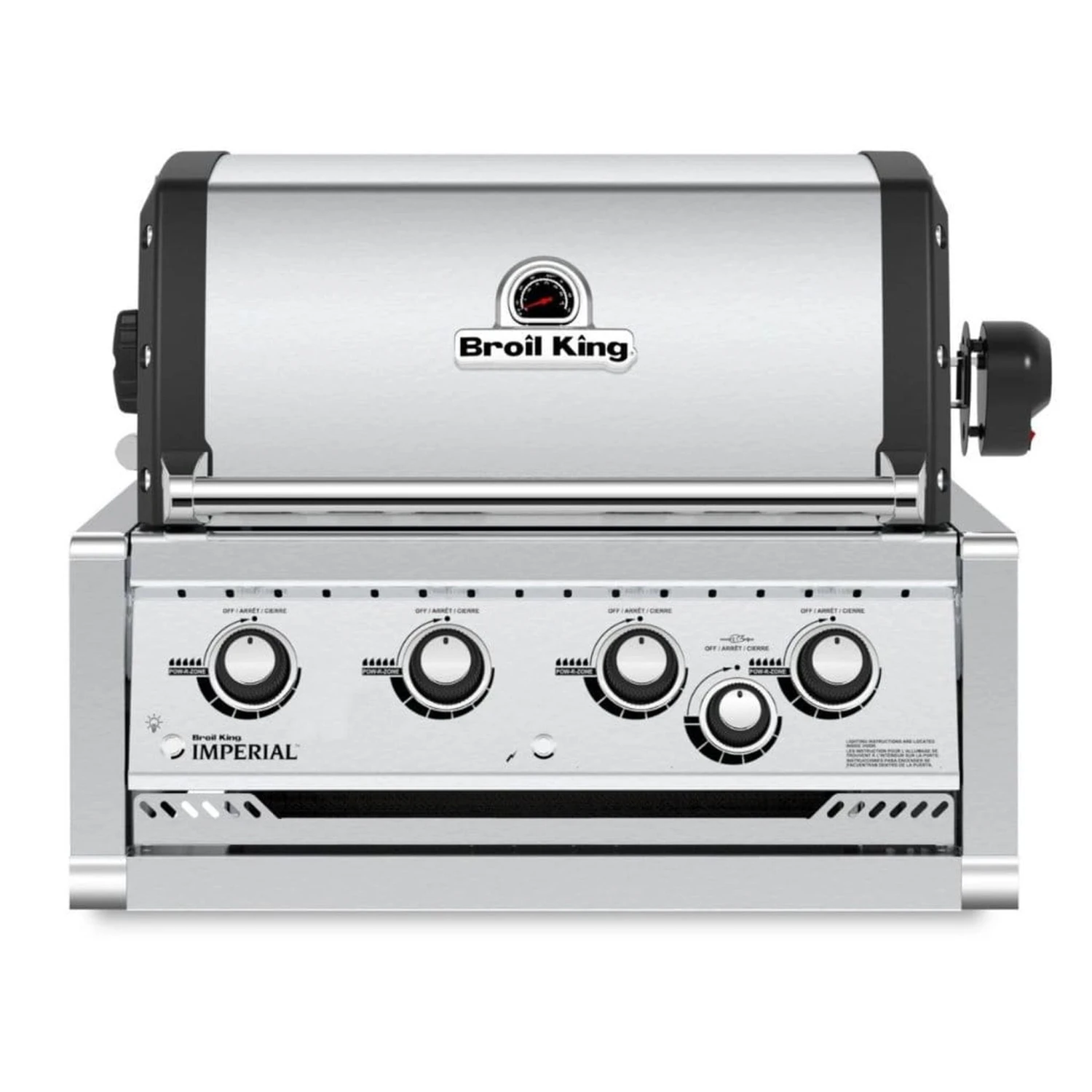 The Broil King® Imperial™ S 470 Built-In features 500 sq. in of primary cooking surface and includes 4 stainless steel Dual-Tube™ burners, 4 professional cast stainless steel cooking grids, stainless steel warming rack, stainless steel Flav-R-Wave™ cooking system, electronic igniter, oven lights, illuminated control knobs, and stainless steel ignition switch.