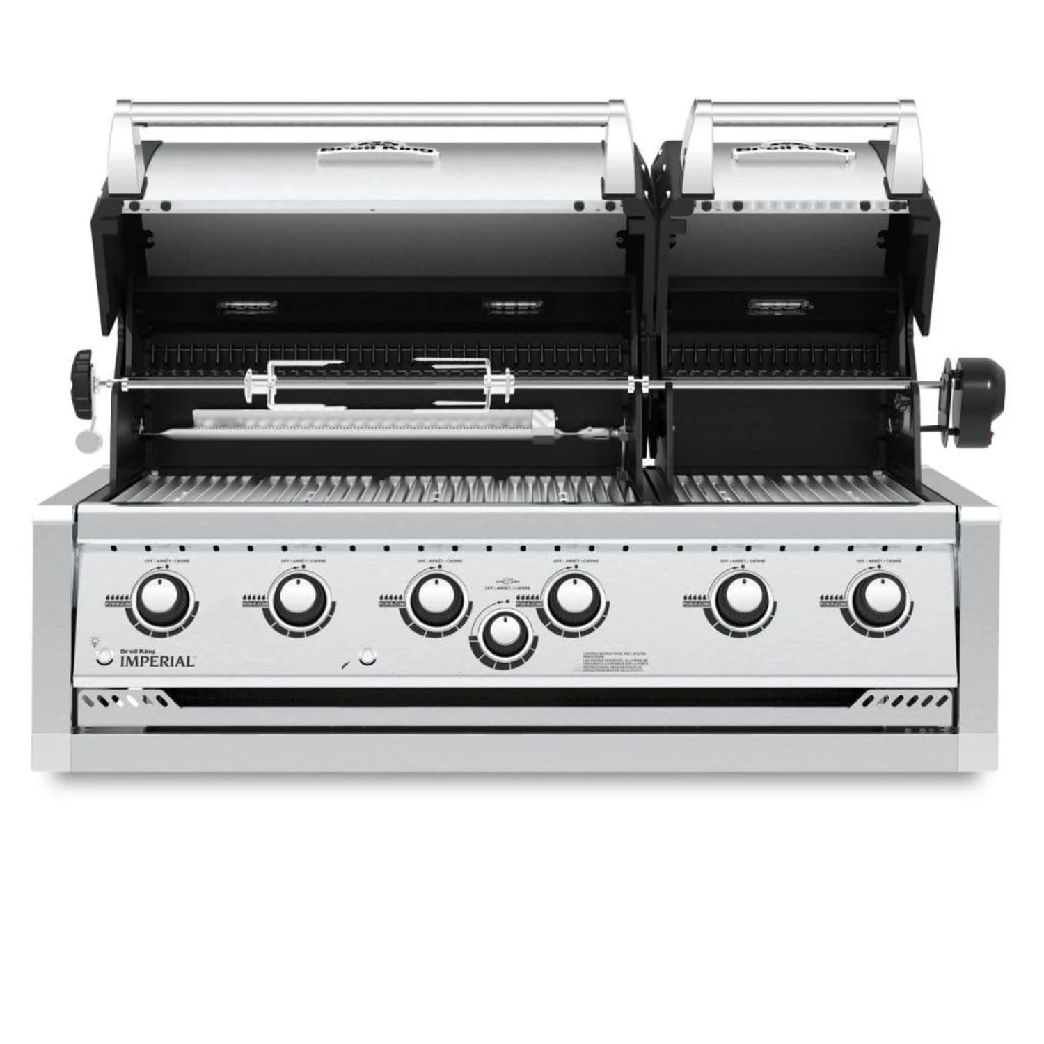 The Broil King® Imperial™XLS 70 Built-In features two totally independent ovens with a total of 750 sq. in of primary cooking surface and includes 6 stainless steel Dual-Tube™ burners, 6 professional cast stainless steel cooking grids, warming rack, stainless steel Flav-R-Wave™cooking system, two electronic igniters, oven lights, illuminated control knobs, and stainless steel ignition switch.