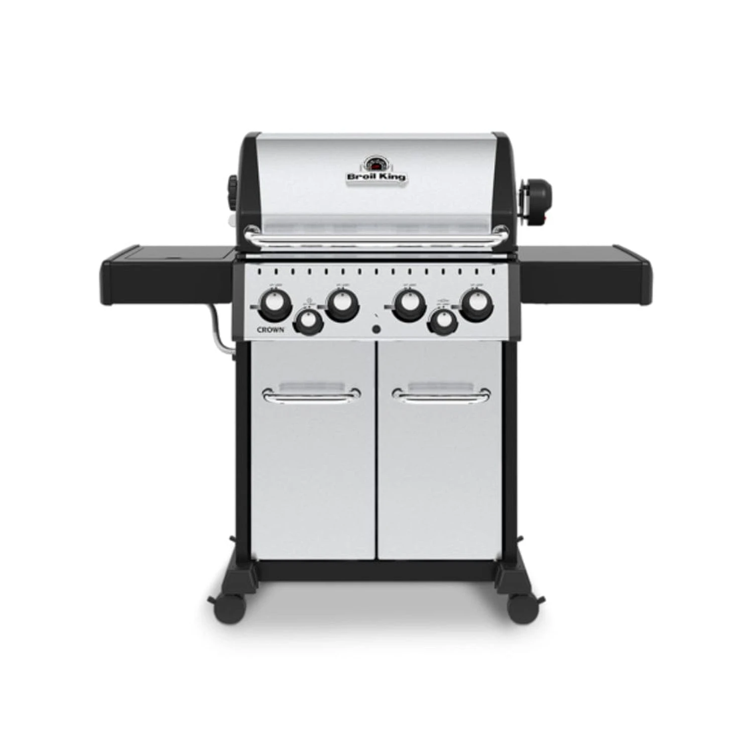 The Broil King® Crown™ 400 Series features a 460 sq. in. primary cooking surface and includes a durable cast aluminum oven, 4 stainless steel Dual-Tube™ burners, stainless steel Flav-R-Wave™ cooking system, and electronic ignition. All Crown 400 series include heavy-duty 3-position cast iron cooking grids, black drop-down side shelves, and an enclosed black cabinet base.