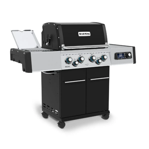 The Regal™ Q 490 Pro IR with iQue™ Technology features 500 sq. in. total cooking space including the stainless steel warming rack, solid 9mm stainless steel cooking grids, stainless steel Flav-R-Wave™ cooking system, 4 stainless steel Dual-Tube™ burners, stainless steel side shelves, illuminated control knobs, and an enclosed cabinet base. The powerful infrared side burner has a solid 9 mm stainless steel cooking grid and aluminum body.