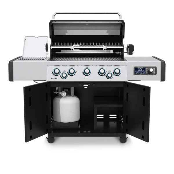 The Regal™ Q 590 Pro IR with iQue™ Technology features 625 sq. in. total cooking space including the stainless steel warming rack, solid 9mm stainless steel cooking grids, stainless steel Flav-R-Wave™ cooking system, 5 stainless steel Dual-Tube™ burners, stainless steel side shelves, illuminated control knobs, and an enclosed cabinet base. The powerful infrared side burner has a solid 9 mm stainless steel cooking grid and aluminum body.
