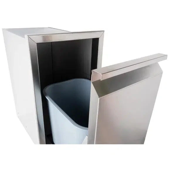 This pull out drawer easily and conveniently stores a 42 quart trash bin (not included) without taking up precious space in your outdoor kitchen. Accented with built-in solid body handles are that are aesthetically pleasing and never need replacing. Built of heavy guage, commercial grade 304 stainless steel to withstand the outdoor elements. This is the perfect storage solution for your outdoor kitchen!