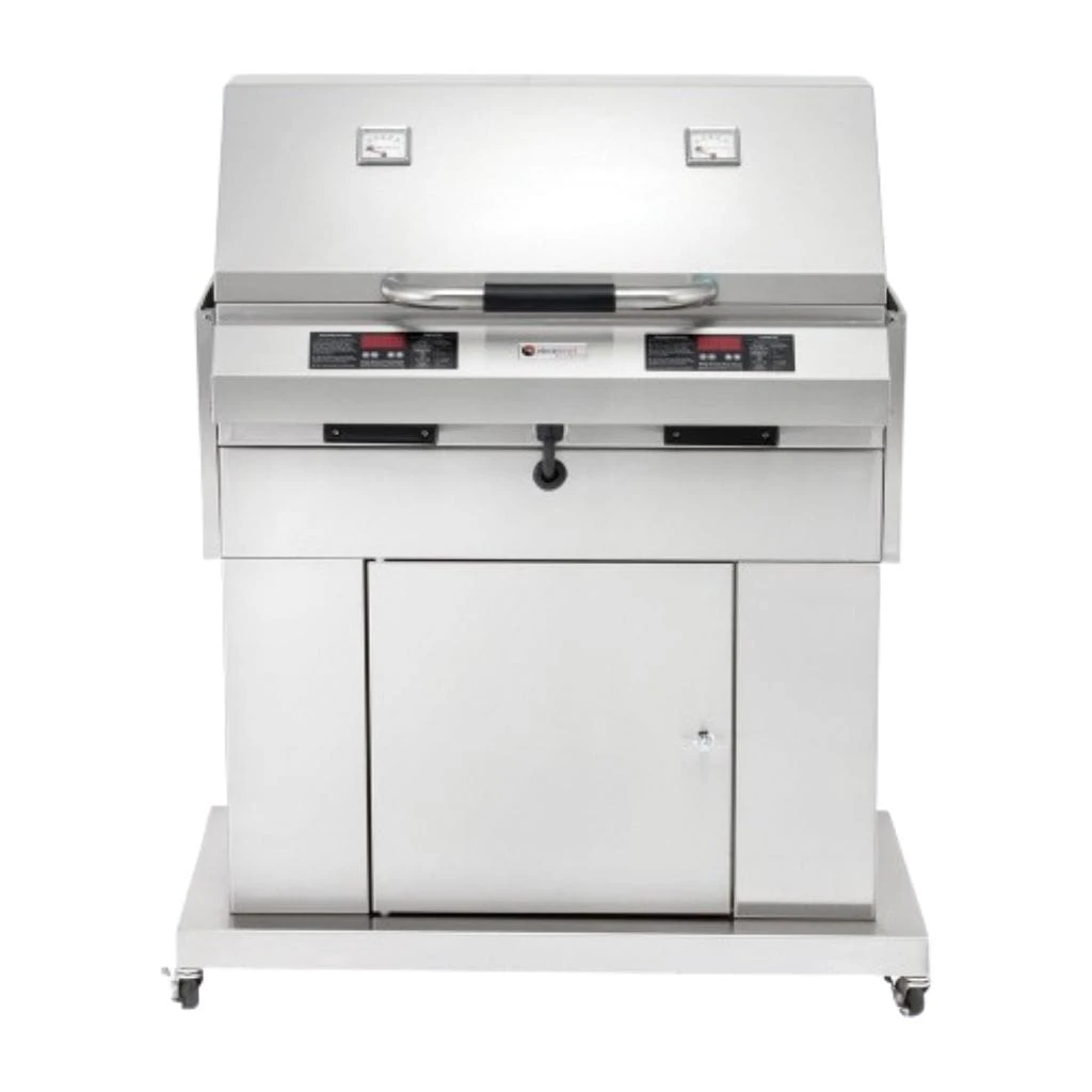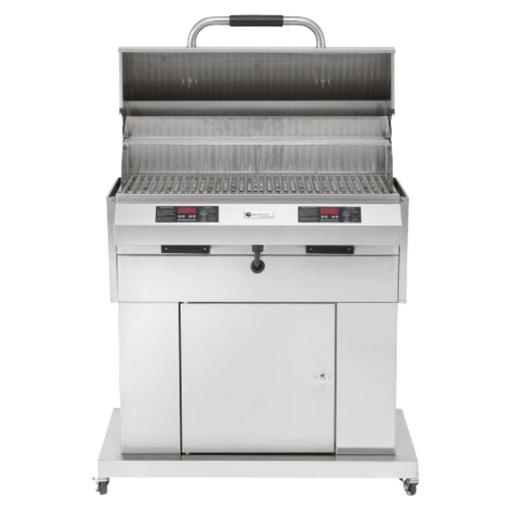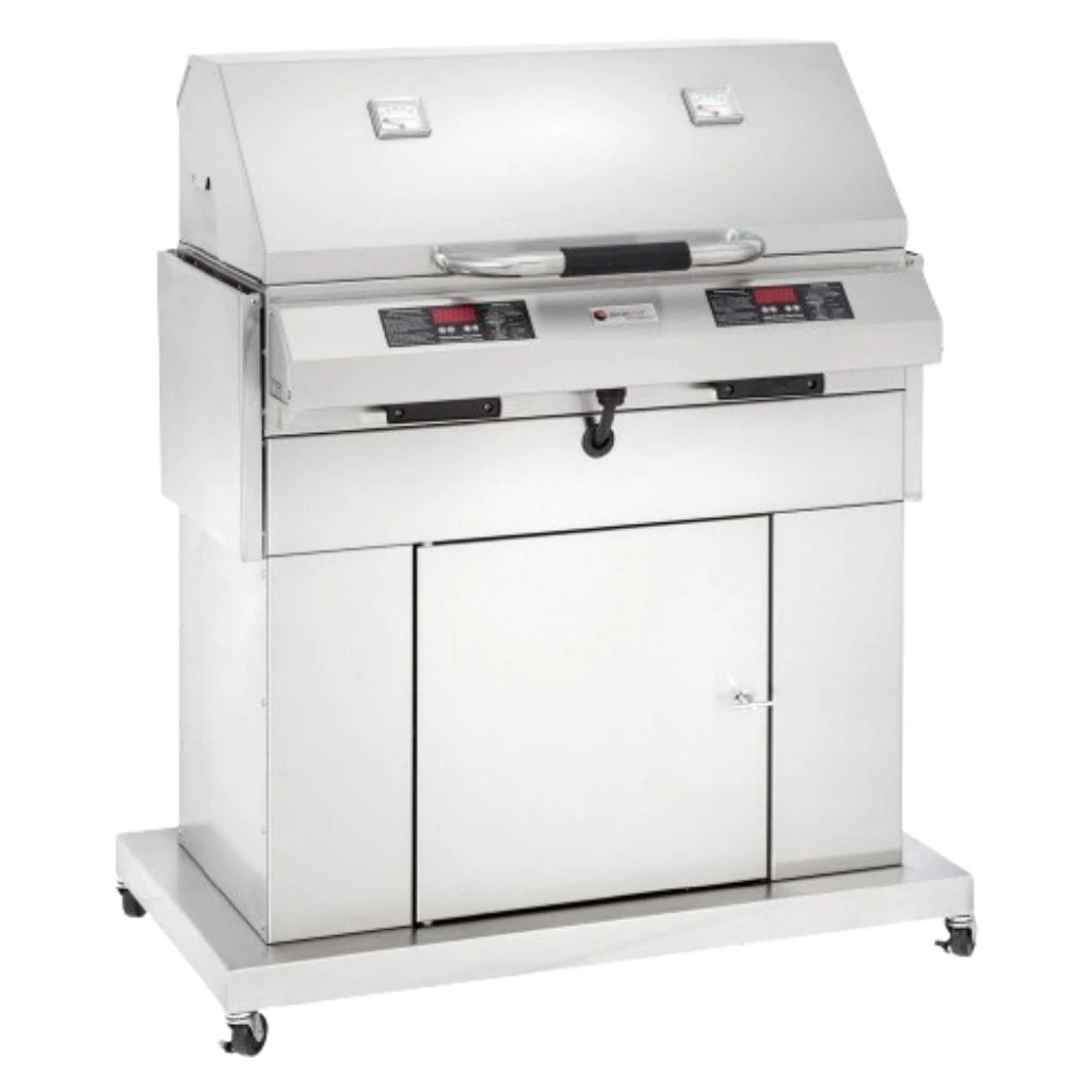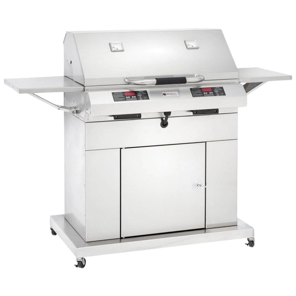 ElectriChef’s Ruby closed-base 220V grills combine high-performance flameless outdoor electric grilling with the ease and utility of integrated storage and mobility. Side shelves provide space for food and utensils and fold down for compact storage. Ample storage under the grill provides space to store utensils and accessories. Casters provide for mobility of the grill when not in use.