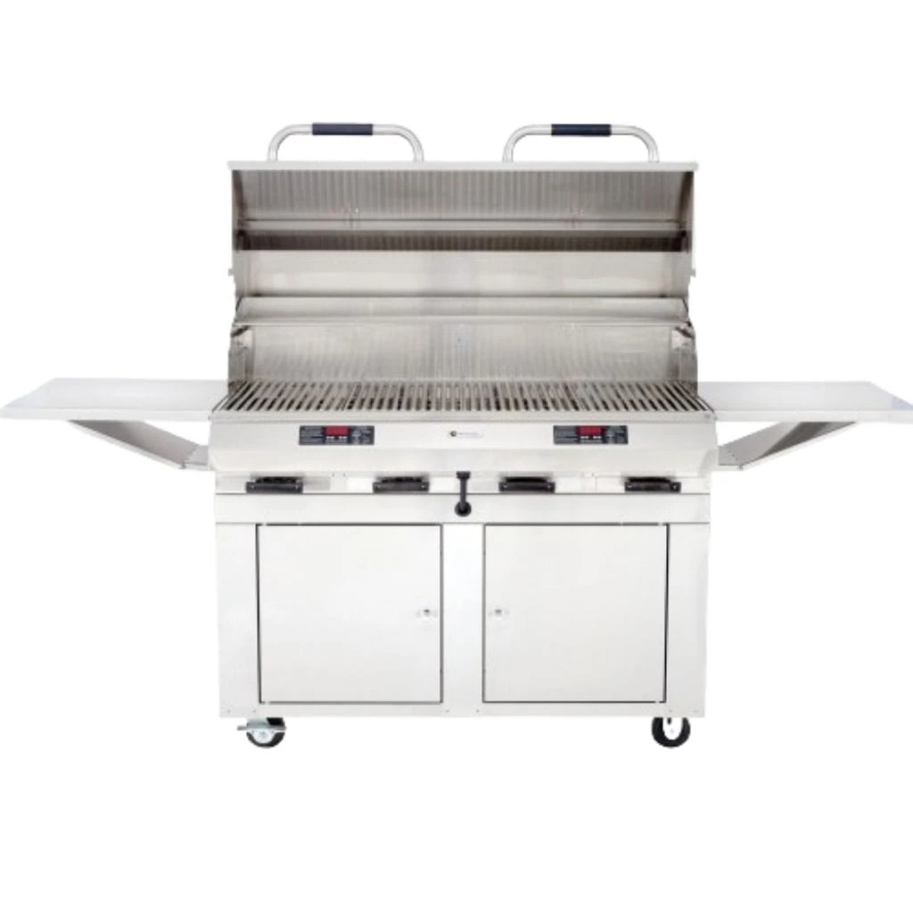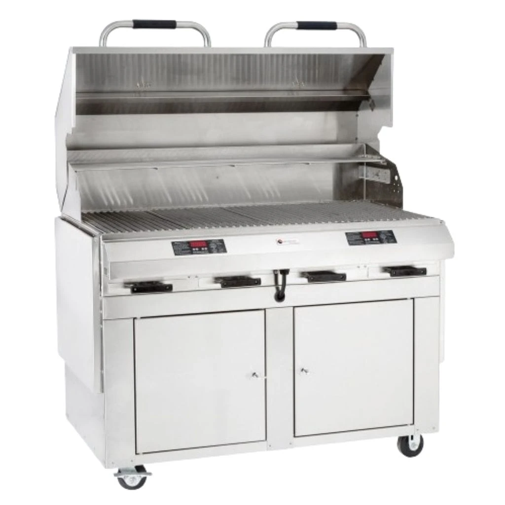 Our Diamond series closed-base flameless electric grill is the epitome of luxury grilling and size. It’s a self-contained grill kitchen large enough to prepare a grilled feast for a crowd. The side-by-side cabinets below can stow all your grilling utensils, pizza and fish pans, grill brushes and serving ware, too. The integrated shelves are sturdy and fold down for easy storage. The dual digital temperature controls allow for grilling at two different temperatures to cook a full meal at the same time.