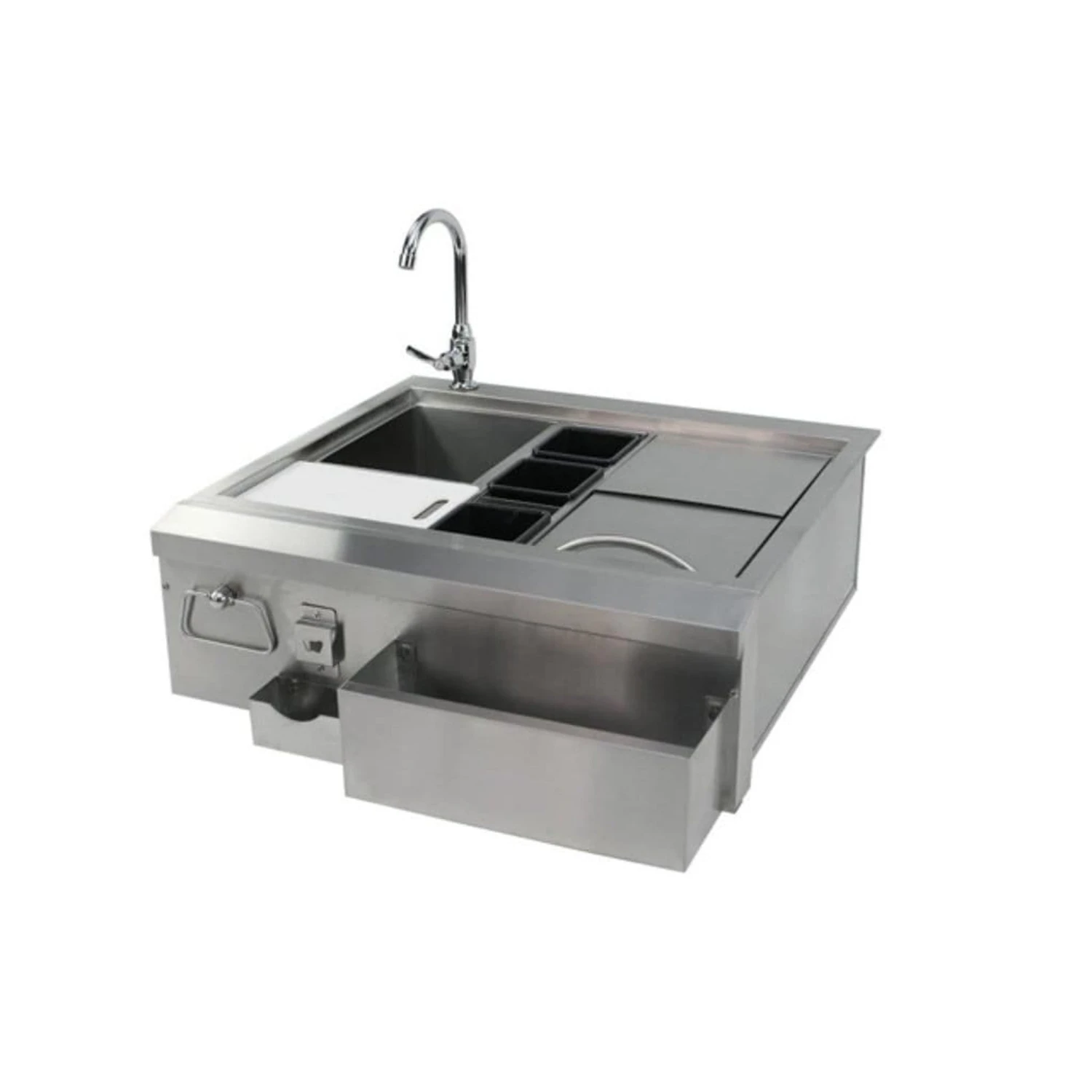 The Jackson Grills 30″ Built-In Cocktail Center is constructed out of stainless steel. Assembled as a complete package, the unit includes a large ice chest with stainless steel cover, a sink, speed rail front bottle storage, bottle boots for chilling mixes, a cutting board, a bottle opener, a towel holder and a cold water tap.