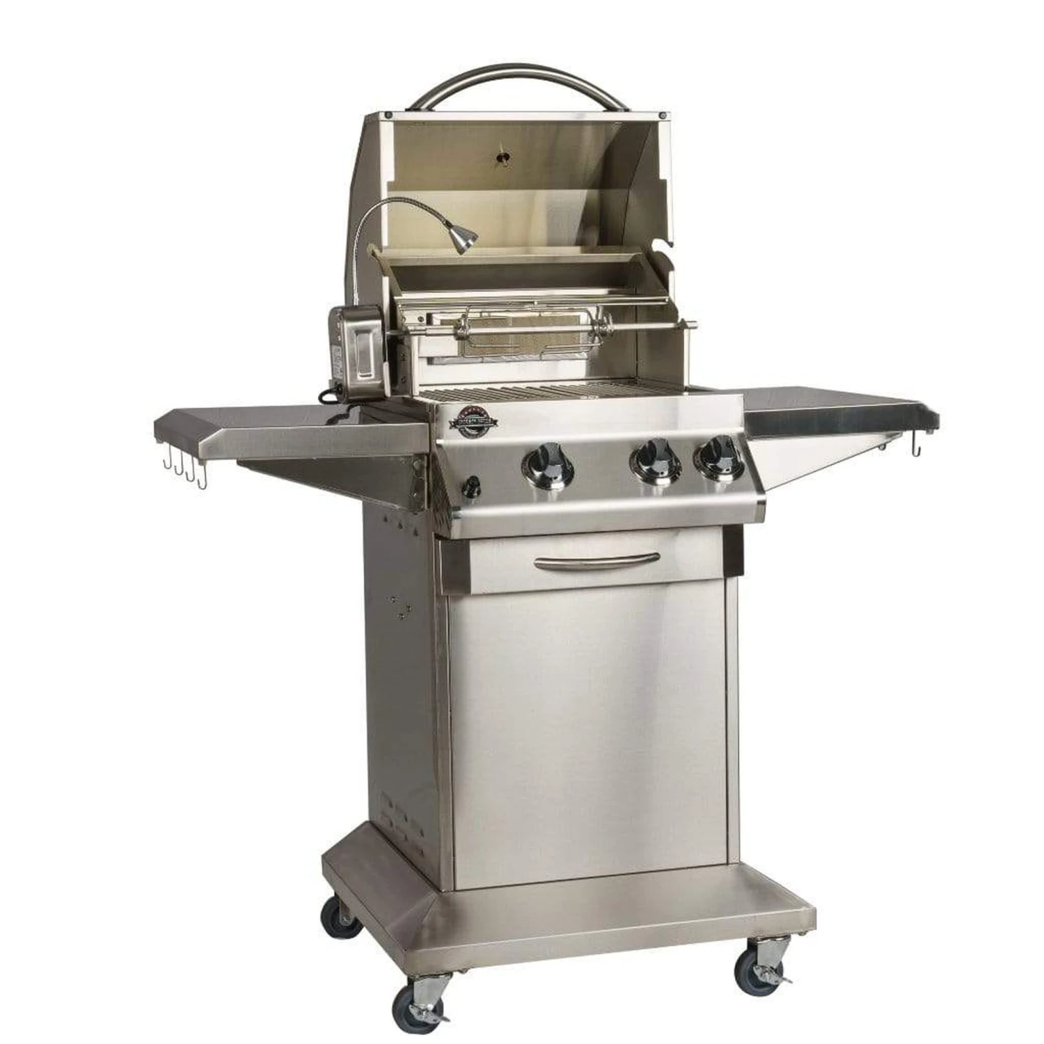 This unit features two stainless steel burners at 15,000 BTU per burner, stainless steel double wall hood and a 7,500 BTU ceramic infrared rear rotisserie burner. This grill offers high quality construction with premium features.