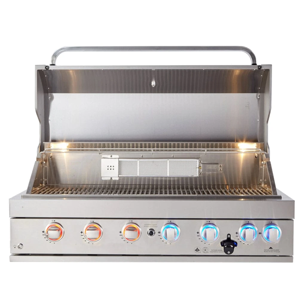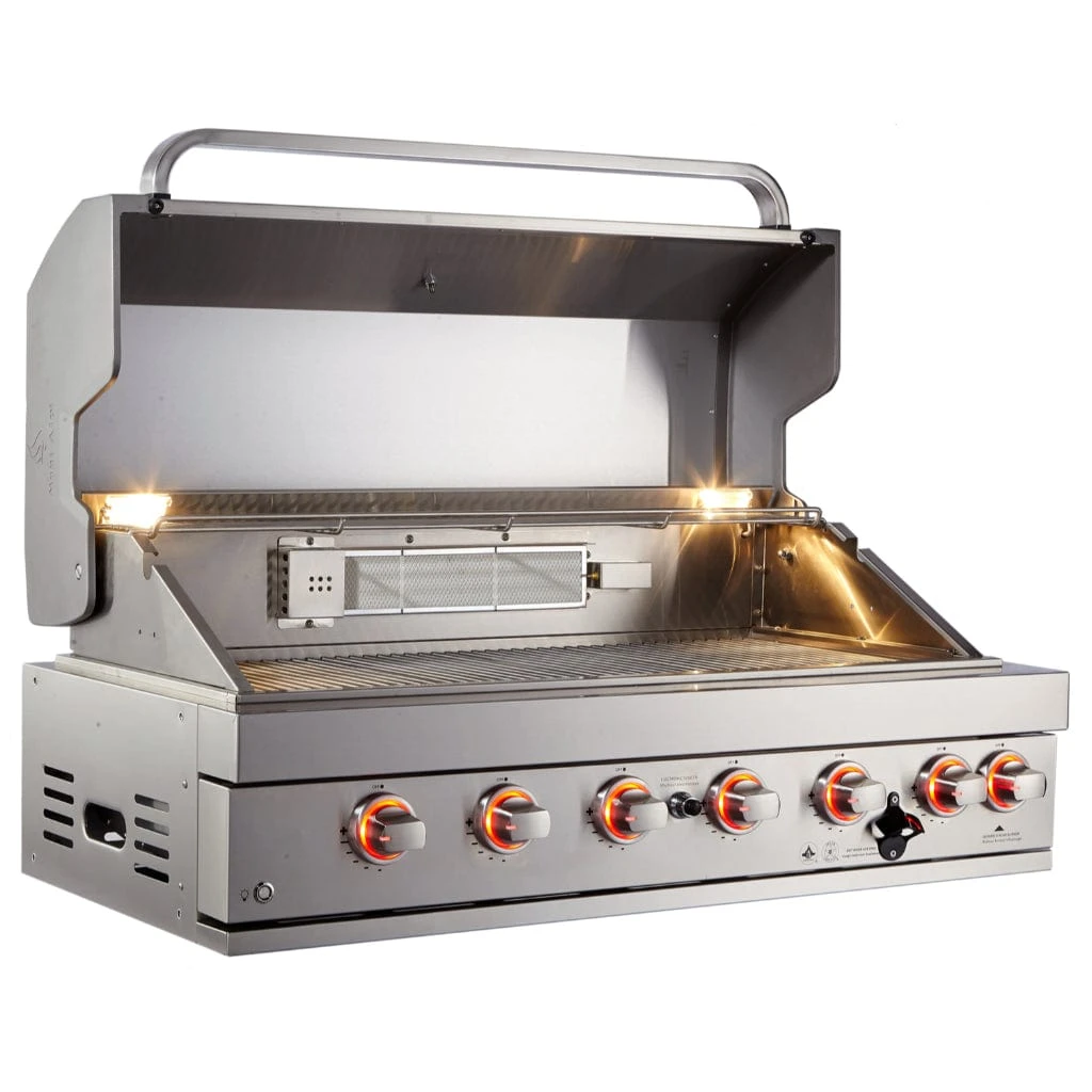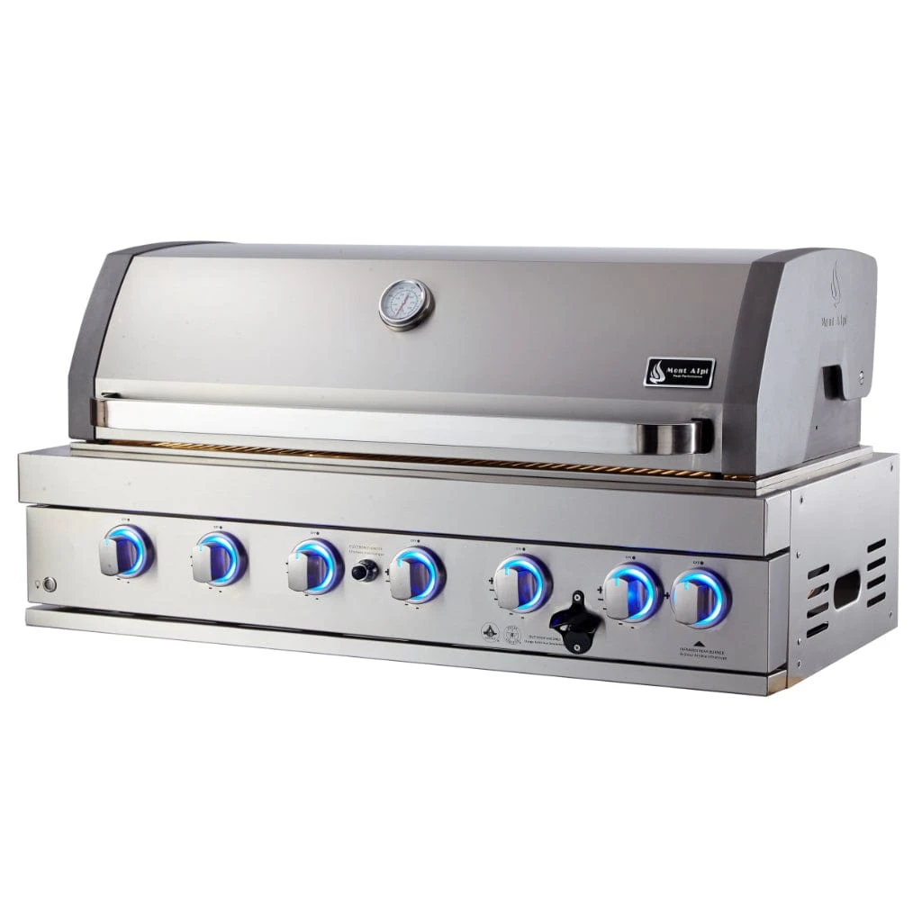 A Robust Stylish and fully equipped Built-In Grill. Offers six heavy-duty 304 Stainless steel burners making even the most beginner chefs able to craft professional meals. It is also equipped with the ceramic infrared back burner great for when you cook a large roast or use the heavy-duty rotisserie kit that is included. The halogen lights in the cooking area are great for cooking in the evening or darker hours and it also has stylish LED lights on the control knobs. The Mont Alpi is the only Grill to have the all new “Heat Wave” Double Layer Sear plates to enhance your cooking experience. This helps reduce the grease flair ups, retains Heat and encourages smoke, smells and flavors that are essential from your bbq. All stainless steel structure on the Mont Alpi Built In is Marine Grade 304, so it is a very heavy-duty and weather-resistant Grill and stands up to whatever the elements may be.