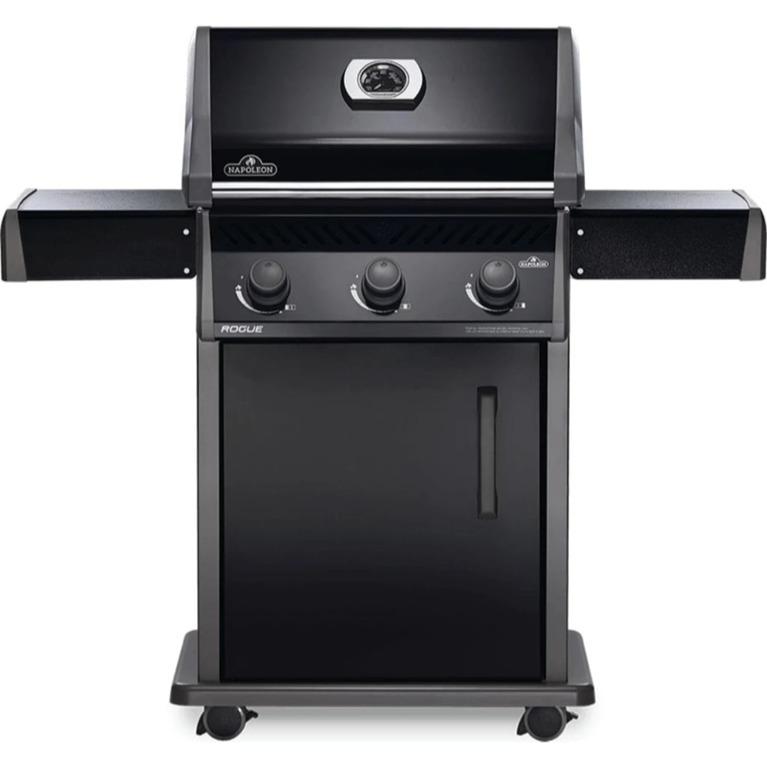 Napoleon’s Rogue® 425 Gas Grill in black, is a premium quality gas grill with an affordable price. Three burners light every time with a battery-free ignition. This grill boasts precise temperature control, high heat searing over cast iron cooking grids and stainless steel sear plates for even heating and to keep your grill clean. The stylish black exterior is highly durable and easy to clean.