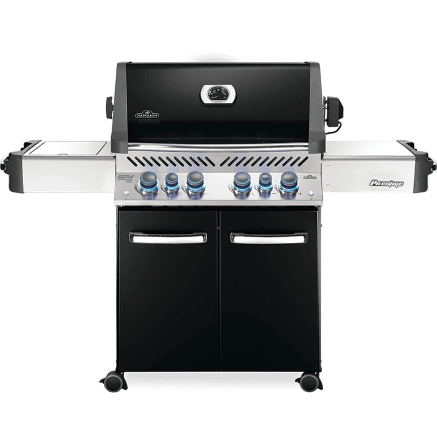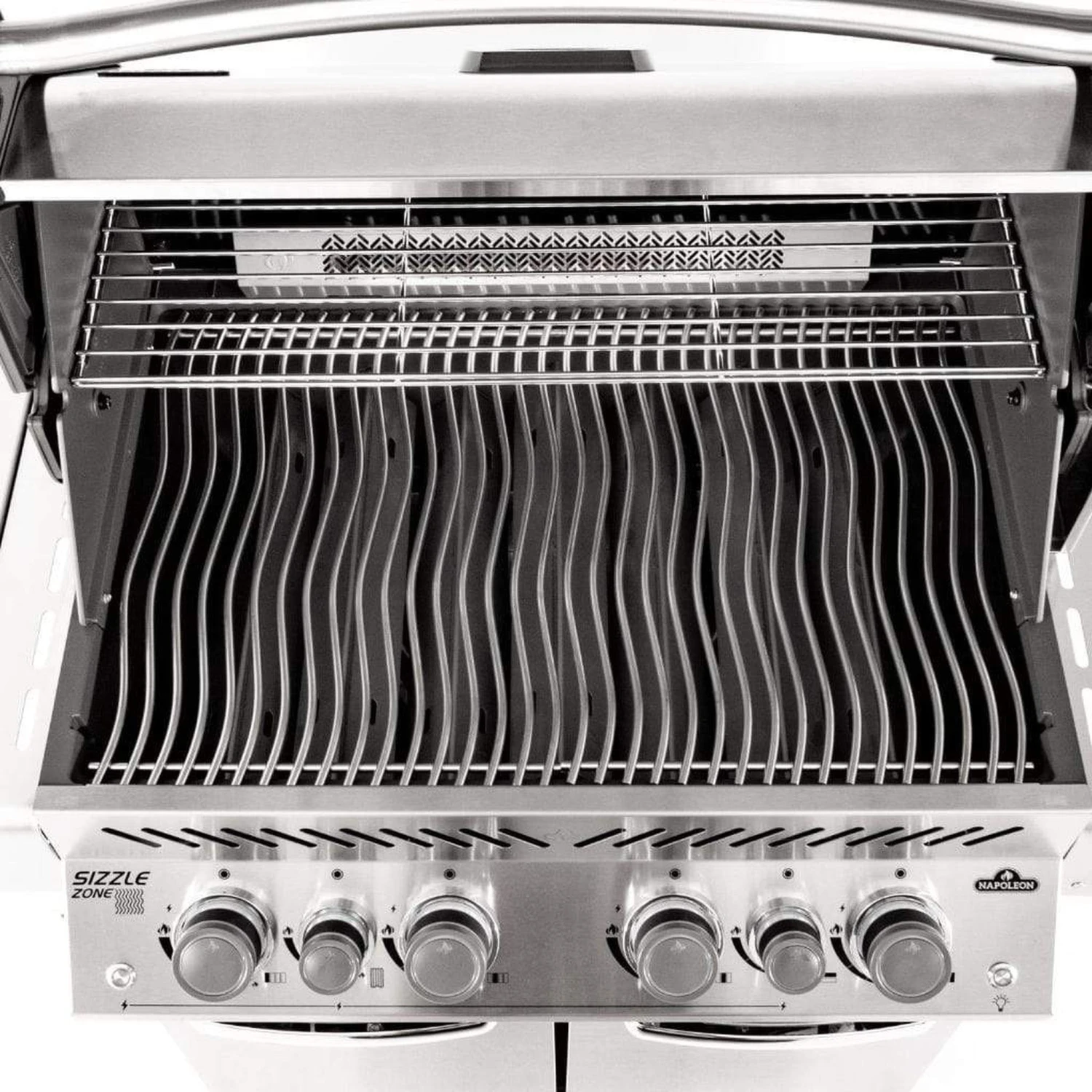 The Napoleon Prestige® 500 Gas Grill with Infrared Side and Rear Burners is the total grilling package; with a stunning all stainless steel hood and stainless steel construction, also available in stunning porcelain enamel black and grey color. This cart model has the capabilities of a full outdoor kitchen. With four main burners, an infrared rear and side burner, this grill can cook meals using eight unique cooking styles. Grill for a crowd with a capacity for up to thirty hamburgers, and up to eight more on the side burner. You’ll know it’s a Napoleon with the Iconic WAVE™ cooking grids for those distinctive sear marks. Not just durable on the outside; under the lid, is the same quality stainless steel used for the tube burners, dual-level sear plates and cooking grids. Seven stainless steel sear plates provide extra surface area for any drippings from your food to vaporize, avoiding flare-ups. Never leave your barbecue on again as all the Prestige® series grills come with the SafetyGlow feature where the control knobs glow red when the burner is on. Enjoy evenly cooked restaurant style meals with the rear infrared burner and rotisserie.