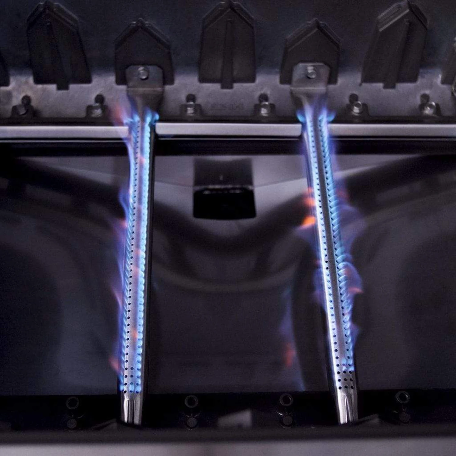 DUAL-LEVEL STAINLESS STEEL SEAR PLATESThe staggered set up creates even heat distribution and protects the burners. |