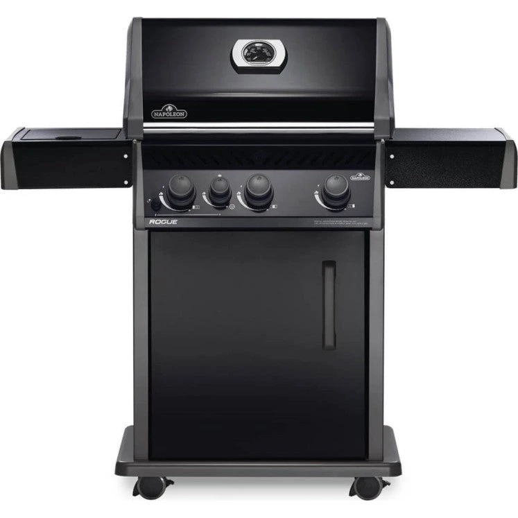 It’s time to break free from boring backyard grilling with the Napoleon Rogue 425 Natural Gas Grill with side burner in black. Sear succulent seasonal treats on our iconic Wave cast iron cooking grids. Three stainless steel burners produce precise heat where you want it, and dual level stainless steel sear plates vaporize the drippings creating intense flavour while you grill. Make marvellous meals for yourself or a crowd while you cook on 425 square inches of main grilling area. Succulent sauces and sides are a snap with the integrated range side burner. The easy to maintain black porcelainized lid and single door with integrated storage blend beautifully with your outdoor décor. Locking casters in the pedestal base mean that this grill can be moved into the thick of the action. Folding stainless steel side shelves save space, allowing the Rogue to fit anywhere in your culinary landscape. No other grill gives you such versatility with an affordable price and high quality components.