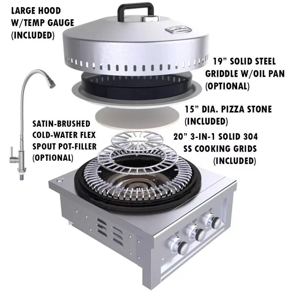 This powerful burner is designed to provide high-cooking heat suitable for large family grilling, WOK stir-fry pan cooking, and even pizza making. The burner also features solid 304 Stainless Steel raised circular 3-IN-1 cooking grates that allow for unlimited ways to cook. Additionally, the burner can be mounted with an optional Cold-Water Pot Filler on either the Left or Right side, making it easy to fill stock-pots or use with any Wok.